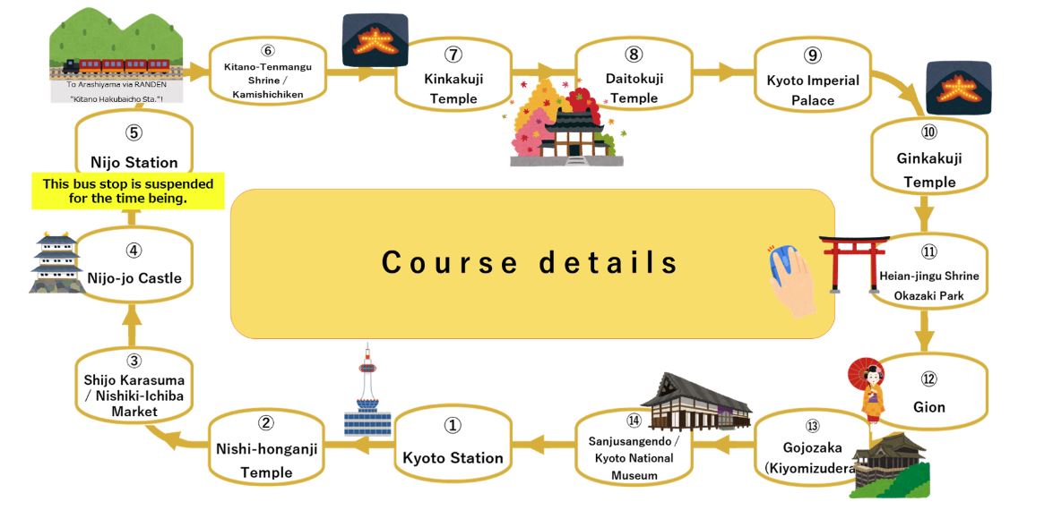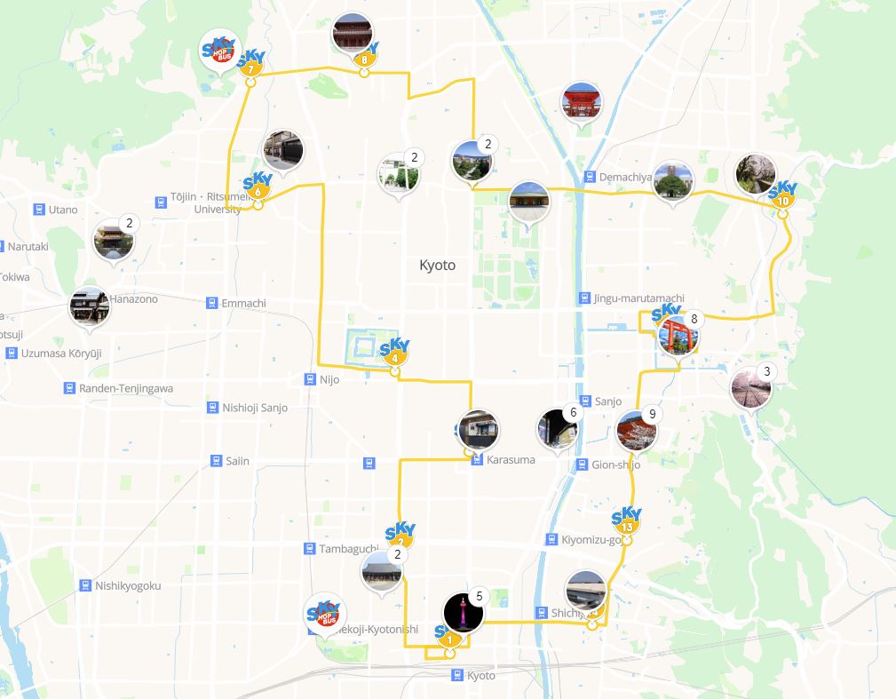 Una de las grandes ventajas que ofrecen los buses turísticos en Japón es que puedes subir y bajar tantas veces como quieras a lo largo de toda la jornada. En concreto en Kioto, puedes acceder al bus con tu ticket en cualquiera de las 13 estaciones que hay repartidas por toda la ciudad.